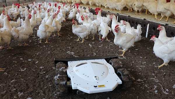 Robot thu gom rác thải, lông rụng và kích thích gia cầm vận động